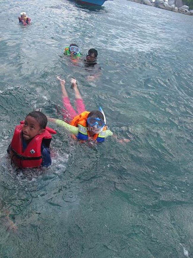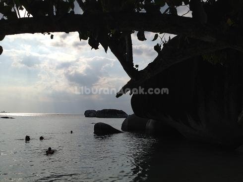 Kami tidak terlalu berlama-lama di Pulau Kepayang. Aidan yang kemudian bangun menyusul kakak-kakak melihat penyu, lalu kembali ke kapal. Sementara itu kakak-kakak kemudian snorkling di dekat pantai. Karena dangkal mereka bisa snorkling tanpa mengenakan life vest. Aira sibuk mengumpulkan kerang untuk dibawa pulang. Sebelum matahari terbenam kami pun naik ke kapal untuk segera kembali ke Tanjung Kelayang.