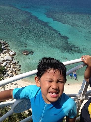 Kami juga mencoba naik ke mercusuar. Untuk naik mercusuar, kita perlu membayar 5000 rupiah perorang, tidak lupa mencuci kaki dulu, agar mercusuar tidak dipenuhi pasir. Untuk naik sampai ke puncak, kita harus melalui 18 tingkat, dengan tangga. Tadinya saya hanya berniat naik sampai setengahnya, karena toh di tiap tingkat ada jendela untuk melihat keluar. Tapi Aira teruuuus naik sampai atas, akhirnya sambil mengatur napas ala pilates (maklum napas anak 11 tahun sama napas ibu-ibu diatas 30 tahun kan beda yaaa..) saya sampai juga diatas. Dan melihat pemandangan dari luar. The view was so worth the 18 stories climb. Aidan kemudian juga menyusul naik ke atas bersama anak-anak kecil yang lain ditemana Tante Yuli dan Bunda Santi. Anak-anak kecil ini lebih gak ada beban lagi naik ke atas. Cuma saya yang agak panikan ketika Aidan ikut keluar, karena gamang tingginya dan anginnya yang kencang. Waktu foto-foto pakai iPhone saja si telpon pintar saya genggam erat-erat, karena seperti mau terbang terbawa angin. Ternyata yang panik memang hanya ibunya saja, Aira dan Aidan super happy berjalan-jalan mengelilingi balkon luar mercusuar, menikmati pemandangan 360 derajat dari Pulau Lengkuas