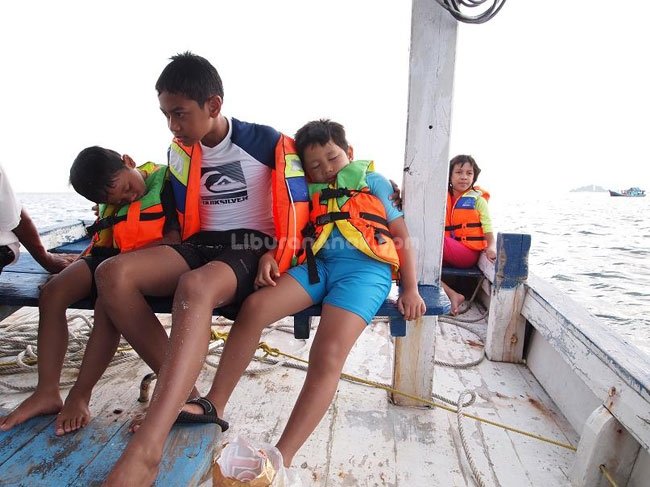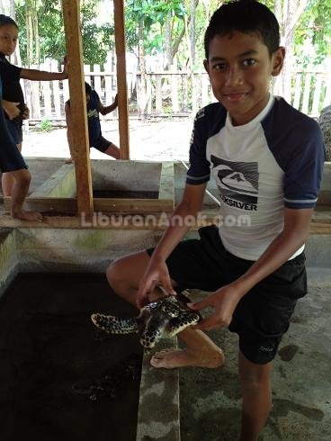 Hari sudah mulai sore sewaktu kami kemudian menuju Pulau Kepayang untuk melihat konservasi penyu. Aidan dan Fino yang ingin ikut kakak-kakak duduk di bagian belakang kapal tertidur sambil bersandar ke abang Alee. Sesampainya di Pulau Kepayang, anak-anak besar langsung melesat menuju konservasi penyu, sementara anak-anak kecil tertidur di kapal.