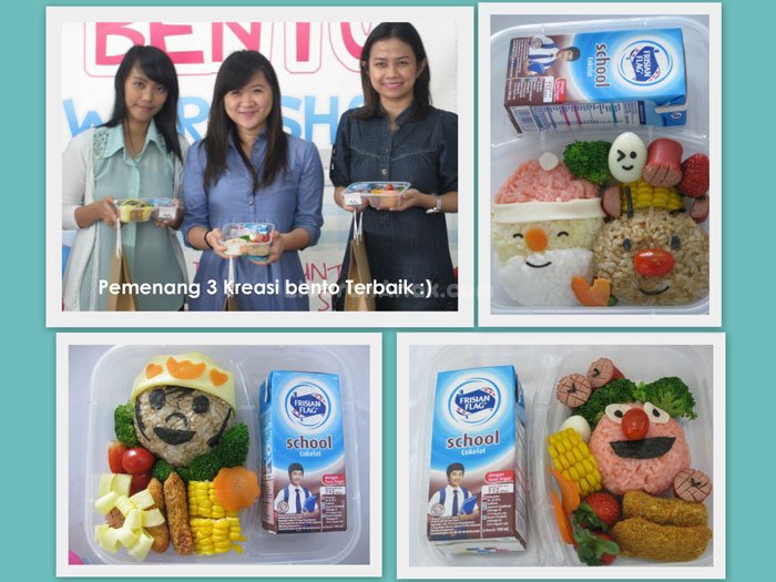 Setelah upload foto bento ke sini untuk ikut lomba Bento Photo Competition, acara pun dilanjutkan dengan memilih 3 peserta dengan bento terbaik. Wah ternyata mereka bertiga ini memang layak dijadikan pemenang karena kreasi bentonya memang unyu, kreatif dan orisinil! Coba liat niy di foto dibawah ini..Keren, simple & jadi makin “panas” pingin bikin bento juga kan? ;)