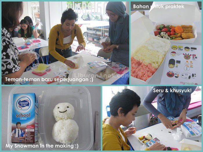 Selain diajari cara membuatt Bento, Pak Lukman dari mymealbox juga mengingatkan peserta bahwa sebaiknya komposisi makanan di dalam bento adalah 50% karbohidrat (nasi, roti, mie), 30% vitamin & mineral (sayur & buah) dan terakhir 20% protein (ayam, daging, ikan dan olahannya) dan sebaiknya ditambah dengan susu sebagai pelengkap & penyeimbang gizi agar anak bisa tetap bersemangat dalam menghadapi tuntutan aktivitasnya yang padat di sekolah.