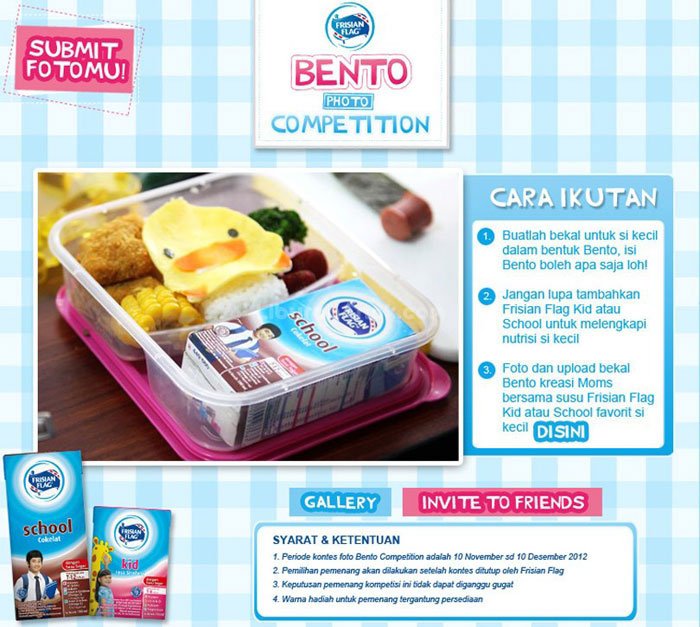 Selesai bikin Bento, masing-masing karya peserta pun di foto oleh panitia dan kami semua disarankan untuk mengikuti Lomba “Bento Photo Competition” , hanya dengan cara meng-upload foto hasil karya bento buatan kita ke Fan Page Facebook Susu Cair Frisian Flag di sini. Upload foto ini masih ditunggu sampai dengan tanggal 10 Desember 2012 lho..jadi ayo ikutan juga yuk! Kalau berhasil menang, hadiahnya ada 3 Galaxy Tab untuk 3 pemenang! Wohhoo, siapa yang gak ngiler coba? Haduhm coba deh yaa, transformasi diriku hanya dalam waktu 1 hari : dari gak PD sama sekali eeehh sekarang malah jadi berani ikutan lomba foto Bento! :D