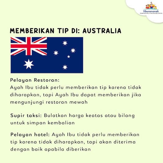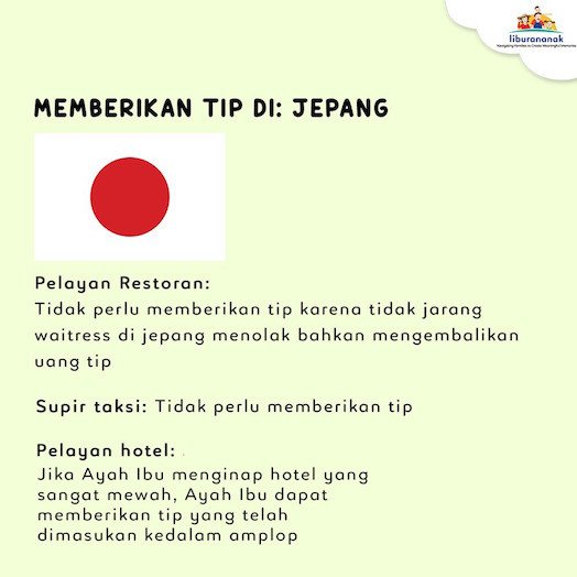 Ayah Ibu tidak perlu memberikan tip karena tidak diharapkan, tapi Ayah Ibu dapat memberikan jika mengunjungi restoran mewah
