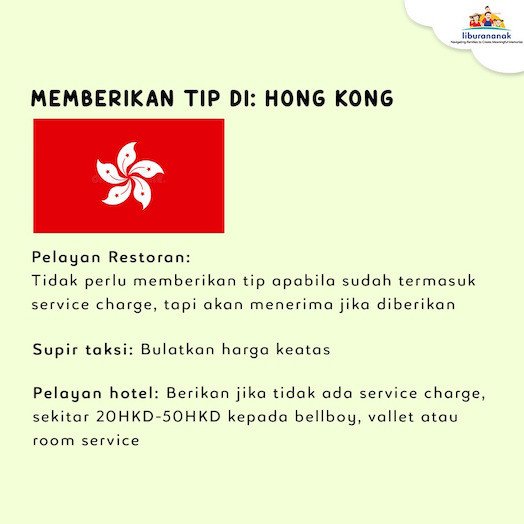 Berikan jika tidak ada service charge, sekitar 20HKD-50HKD kepada bellboy, vallet atau room service
