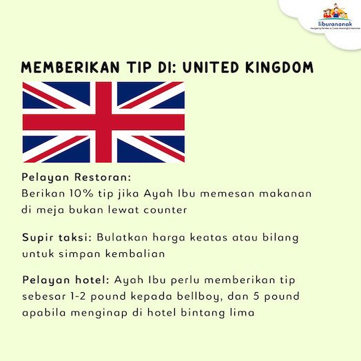 Pelayan hotel : Ayah Ibu perlu memberikan tip sebesar 1-2 pound kepada bellboy, dan 5 pound apabila menginap di hotel bintang lima