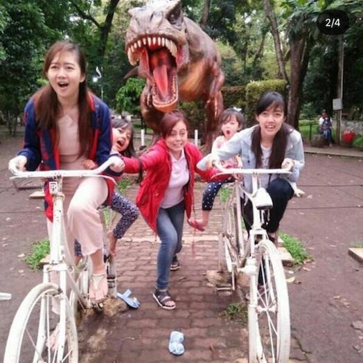 Belum “sah” ke Taman Lansia kalau belum berfoto menaiki patung replika sepeda sambil ekspresi ngeri karena mau dikunyah sama si T-Rex .