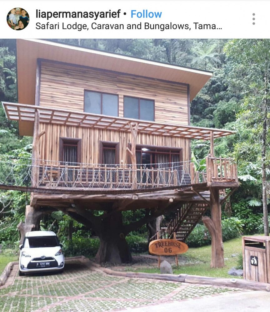 Safari Lodge Hotel sebagai pilihan tempat bermalam dengan fasilitas kamar hotel namun tetap dekat dengan alam. Menginap di rumah pohon akan menyempurnakan petualangan anda di Taman Safari Indonesia Bogor. Anda bagaikan di alam rimba, terdengar gemericik aliran air dan kemudian anda berada di atas pohon dan bemalam disana. Ini akan menjadi petualangan yang istimewa. Tiap unit rumah pohon ini memiliki kapasitas 4 orang, dengan 2 type tempat tidur yaitu king size dan tempat tidur susun untuk buah hati tercinta.