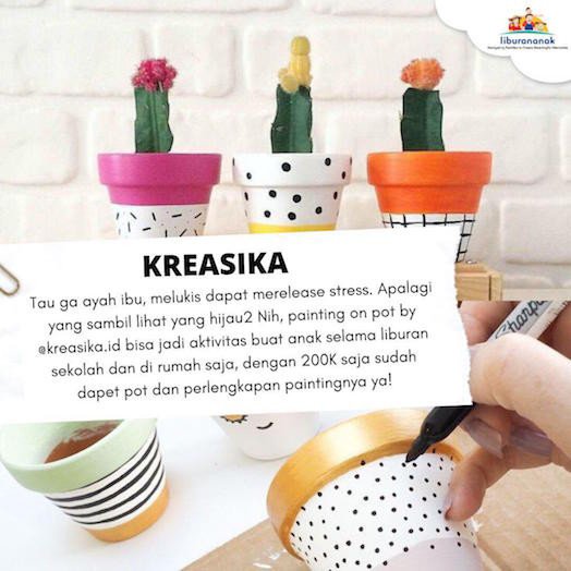 Tau ga Ayah Ibu, melukis dapat merelease stress. Apalagi yang sambil lihat yang hijau2 Nih, painting on pot by @kreasika.id bisa jadi aktivitas buat anak selama liburan sekolah dan dirumah saja, dengan 200K saja sudah dapet pot dan perlengkapan paintingnya ya!
