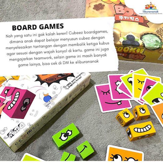 Nah yang satu ini gak kalah keren! Cubeez boardgames, dimana anak dapat belajar menyusun cubez dengan menyelesaikan tantangan dengan membalik ketiga kubus agar sesuai dengan wajah konyol di kartu. Game ini juga mengajarkan teamwork, selain game ini masih banyak game lainnya, bisa cek di DM ke @liburananak