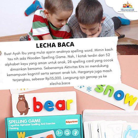 Buat Ayah Ibu yang mulai ajarin anaknya spelling word. Mimin kasih tau nih ada Wooden Spelling Game. Nah, 1 kotak terdiri dari 52 alphabet kayu yang aman untuk anak, 28 spelling card yang cocok dimainkan bersama. Sebenarnya Aktivitas Kits ini mendukung kemampuan kognitif serta sensori anak loh. Harganya juga masih terjangkau, sebesar Rp 115,000. Langsung aja gercep ya ke @lecha.baca
