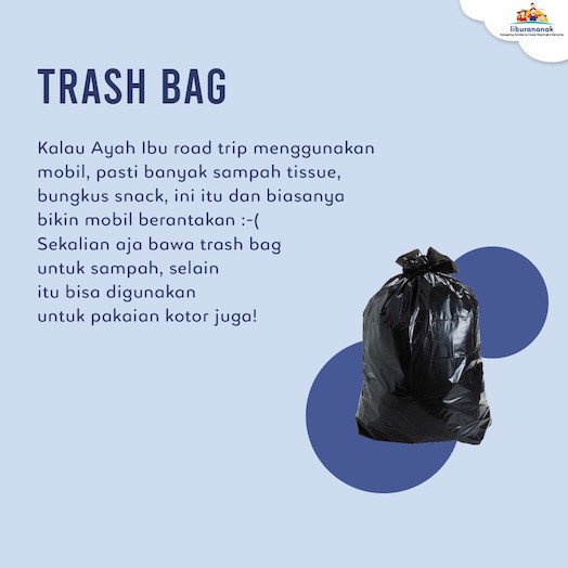 Kalau Ayah Ibu road trip menggunakan mobil, pasti banyak sampah tissue, bungkus snack, ini itu dan biasanya bikin mobil berantakan :-( Sekalian aja bawa trash bag untuk sampah, selain itu bisa digunakan untuk pakaian kotor juga!