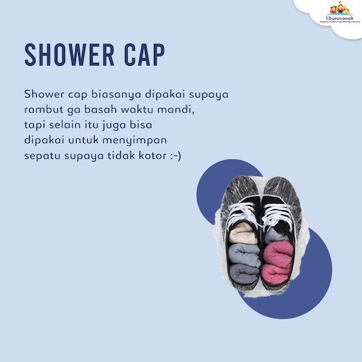 Shower Cap biasanya dipakai supaya rambut ga basah waktu mandi, tapi selain itu juga bisa dipakai untuk menyimpan sepatu supaya tidak kotor
