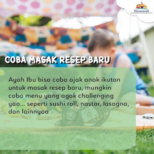 Ayah Ibu bisa coba ajak anak ikutan untuk masak resep baru, mungkin coba menu yang agak challenging ya… seperti sushi roll, nastar, lasagna, dan lainyaa