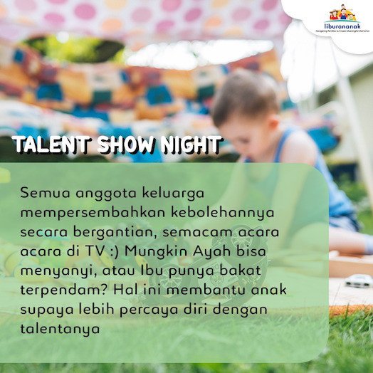 Semua anggota keluarga mempersembahkan kebolehannya secara bergantian, semacam acara acara di TV :) Mungkin Ayah bisa menyanyi, atau Ibu punya bakat terpendam? Hal ini membantu anak supaya lebih percaya diri dengan talentanya