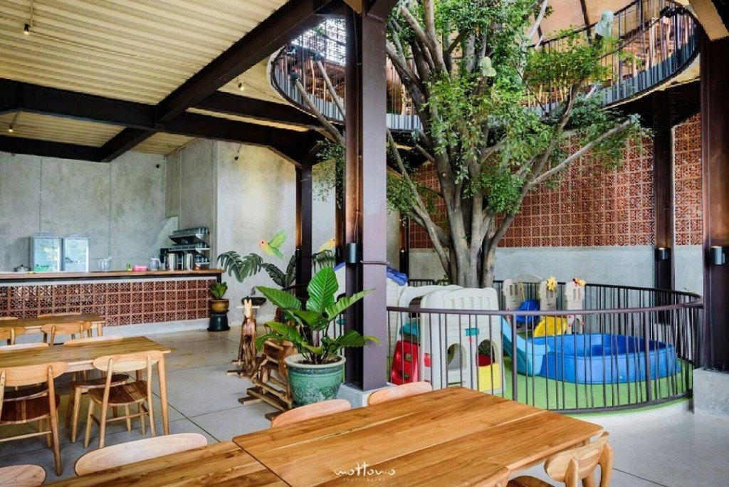 Restoran Kluwih Sunda Autenthic dibangun di atas lahan yang memiliki pohon besar. Alih-alih ditebang. pohon tersebut justru dibiarkan berpadu apik dengan area tempat makan. Terlihat sangat pas dengan interior yang didominasi kayu. Kehadiran tanaman ‘raksasa’ di tengah-tengah tempat makan juga menjadikan suasana lebih sejuk.