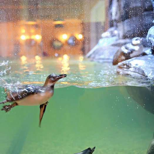 The restaurant is decorated with beach house concept using white, blue and turquoise colors with dimmed light, there’s children playground area in the corner to entertain the kids and also a huge aquarium as the playground of penguins.